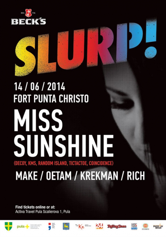Kao i proteklih godina Slurp! Festival i ove će se sezone zbivati u 4 pojedinačna termina, počevši sa partyjem otvorenja u subotu 14. lipnja. S velikim zadovoljstvom najavljujemo da će naša techno diva, Miss Sunshine, biti zadužena za podizanje i održavanje uzavrele atmosfere spomenutog partyja otvorenja. Zabilježite i datume ostala tri termina – 5. srpnja, 2. kolovoza te završni party, zatvaranje sezone u subotu 27. rujna. Imena ostalih gostiju, cijene ulaznica i ostale bitne informacije biti će objavljena uskoro.